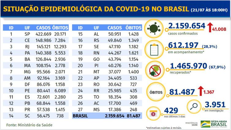 Dados do Ministério da Saúde mostram que 1.465.970 pessoas se recuperaram da covid-19 no Brasil, ou seja, 67,9%. Neste momento, 612.197 pacientes em todo o país estão em acompanhamento.