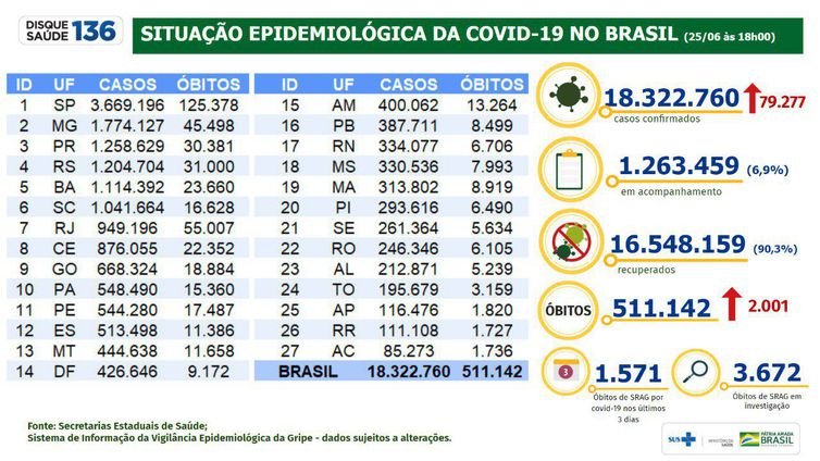 Os dados estão na atualização diária do Ministério da Saúde. O balanço é produzido a partir das informações sobre casos e mortes recolhidas pelas secretarias estaduais de saúde.