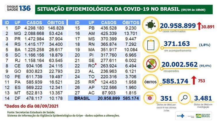 Com os novos casos, o total de pessoas infectadas pelo novo coronavírus chegou a 20.958.899. A média móvel de casos está em 20,1 mil, a menor desde o início do ano conforme o Ministério da Saúde.