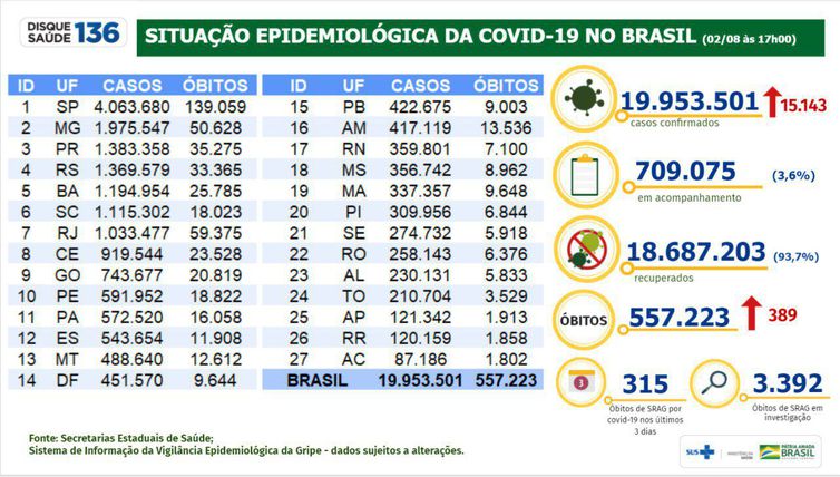Os dados estão no balanço diário do Ministério da Saúde, divulgado pela pasta nesta segunda-feira (2). A atualização consolida os registros levantados pelas secretarias estaduais de Saúde sobre casos e mortes relacionados à covid-19.
