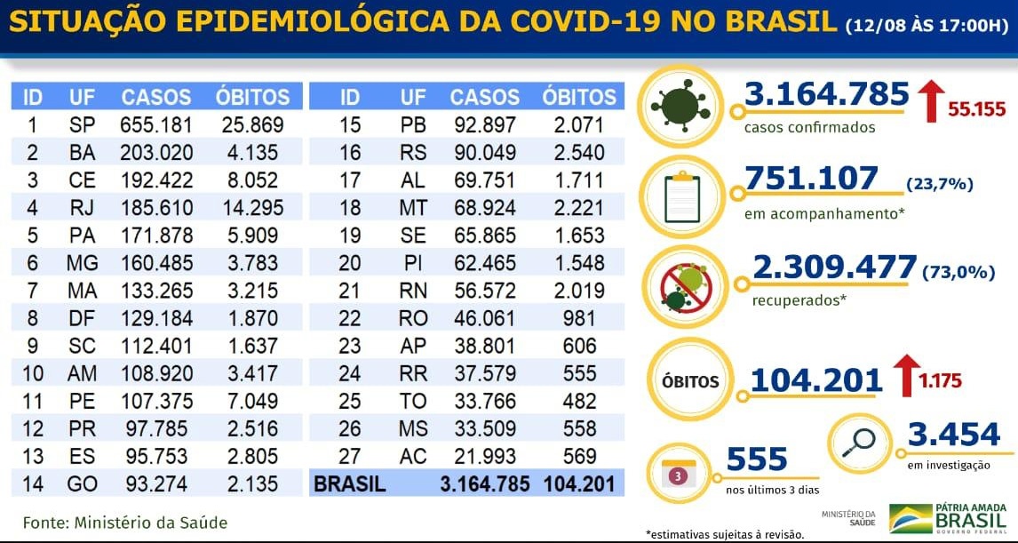 O Brasil chegou a 104.201 mortes em função da pandemia do novo coronavírus. Os dados foram divulgados na entrevista coletiva de apresentação do Boletim Epidemiológico do Ministério da Saúde hoje (12). Ontem o painel trazia 103.026. Ainda há 3.454 óbitos em investigação.
