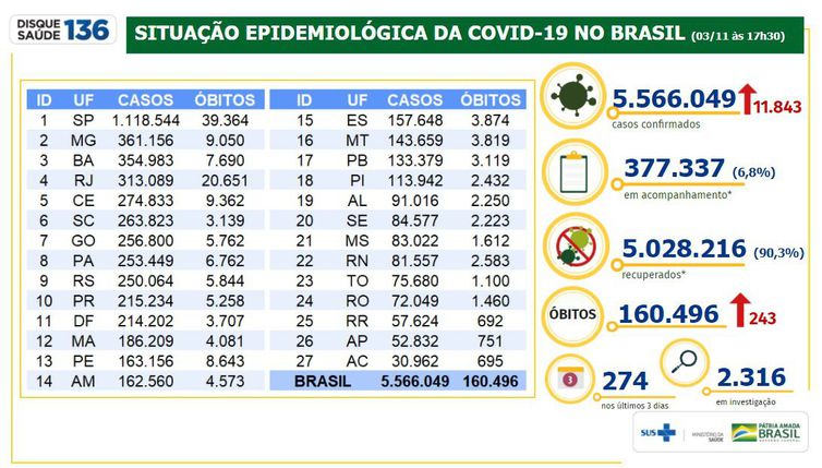 As mortes decorrentes da pandemia do novo coronavírus chegaram a 160.496, de acordo com o balanço do Ministério da Saúde divulgado na noite desta terça-feira (3), a partir de dados das secretarias estaduais de saúde.