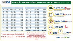 O balanço não acrescentou novos casos em acompanhamento, permanecendo 364.575 desde o dia 4 de novembro. O mesmo vale para as pessoas que já se recuperaram da doença, totalizando 5.064.344. O Ministério da Saúde afirmou que a dificuldade na atualização se deu por causa da queda dos seus sistemas internos que ocorreu na semana passada e até o momento vem ensejando dificuldades para a sistematização dos dados.