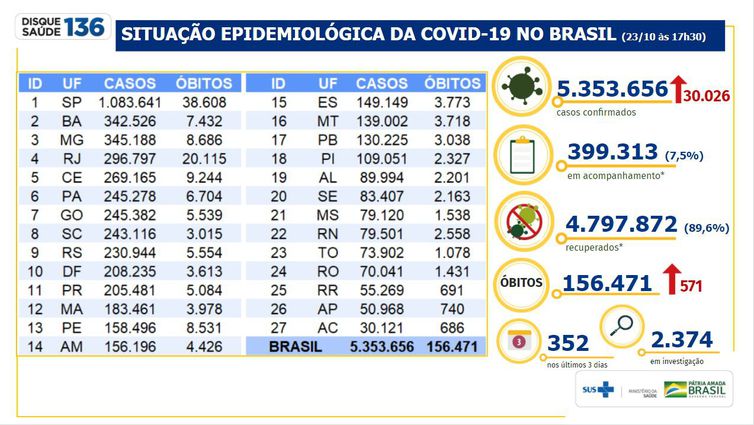 Covid-19: Brasil tem 5,35 milhões de casos e 156,4 mil mortes