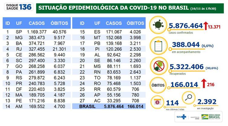 O balanço apontou também 388.044 pacientes em acompanhamento. Outros 5.322.406, equivalentes a 90,6% do total de infectados, já se recuperaram da doença.