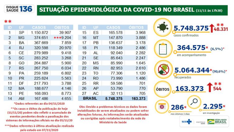 São Paulo chegou a 1.150.872 casos. Mesmo há quatro dias sem atualizar o número de casos, Minas Gerais aparece em segundo, com os mesmos 374.651 casos registrados no dia 7 de novembro. Bahia (367.669) e Rio de Janeiro (320.598) aparecem na sequência. O Acre tem o menor número de casos (32.113). Em seguida estão Amapá (53.790) e Roraima (59.586).