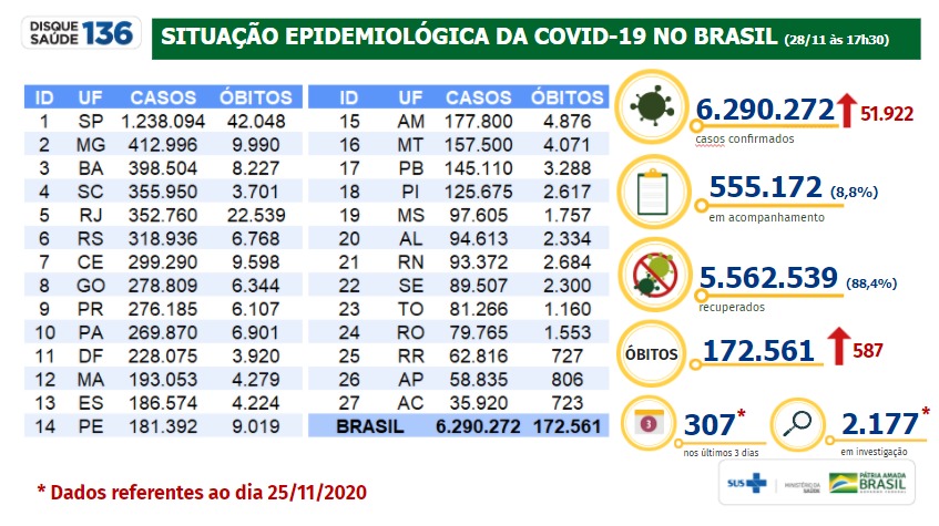 O número de casos acumulados do novo coronavírus (covid-19) no Brasil atingiu 6.290.272, um aumento de 51.922 infecções registradas nas últimas 24 horas, segundo balanço do Ministério da Saúde, atualizado neste sábado (28).