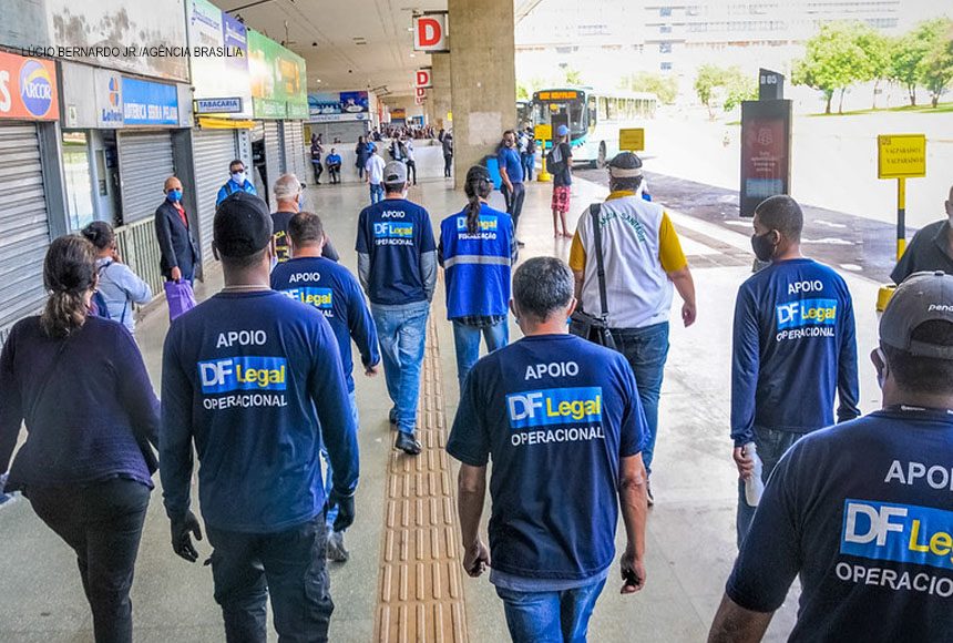 A obrigatoriedade do uso de máscaras faciais em áreas públicas começou a ser fiscalizada nesta segunda-feira (18). Servidores de dez órgãos do Governo do Distrito Federal estão envolvidos nas ações – que se concentram em terminais rodoviários, estações do metrô e nas proximidades dos comércios das cidades, onde há aglomeração de pessoas. Nesta manhã, o governo não registrou nenhum caso de desobediência a utilização dos protetores faciais.