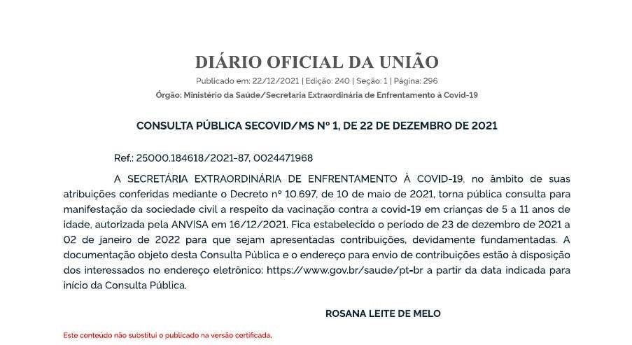 O Ministério da Saúde oficializou hoje (22) a consulta pública que coletará manifestações da sociedade civil sobre a vacinação contra a covid-19 em crianças com idade de 5 a 11 anos. A vacina da Pfizer para essa faixa etária foi autorizada recentemente pela Agência Nacional de Vigilância Sanitária (Anvisa). O período de consulta terá início amanhã (23) e vai até o dia 2 de janeiro de 2022.