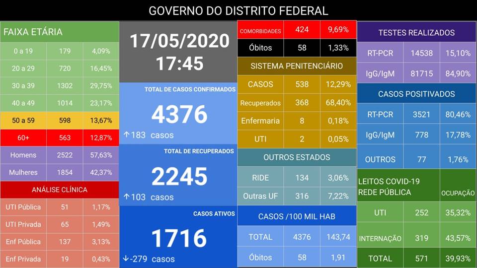 O Distrito Federal chegou à marca de 4.376 infectados por coronavírus, neste domingo (17/05). A capital teve 129 novos casos registrados entre 13h e 18h de hoje. O boletim divulgado pela Secretaria de Saúde do Distrito Federal (SES-DF) pela manhã tinha 4.247 casos.