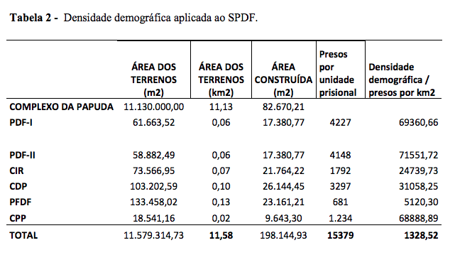 Densidade de detentos confinados por quilômetro quadrado, no sistema penitenciário, é cerca de 300% superior a do DF