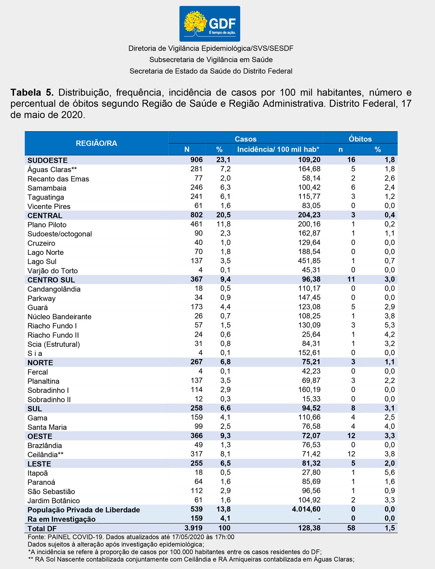 Embora o percentual, seja relativamente baixo, em todo o DF, ao se comparar com o número de casos confirmados, nas Regiões Administrativas (RAs), dados do Boletim Epidemiológico da Secretaria de Estado de Saúde do DF (SES-DF)(17/Mai), aponta que o SPDF supera todas as RAs, se comparado a quantidade de casos confirmados, a exemplo de Plano Piloto (461), Ceilândia (317), Águas Claras (281) e Samambaia (246) ou Taguatinga (241).