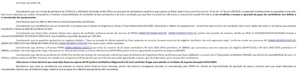 “Entramos em contato com a Engenharia Clínica e nos foi informado que eles aguardam a chegada de peças importadas”, diz o despacho encaminhado ao Samu-DF.