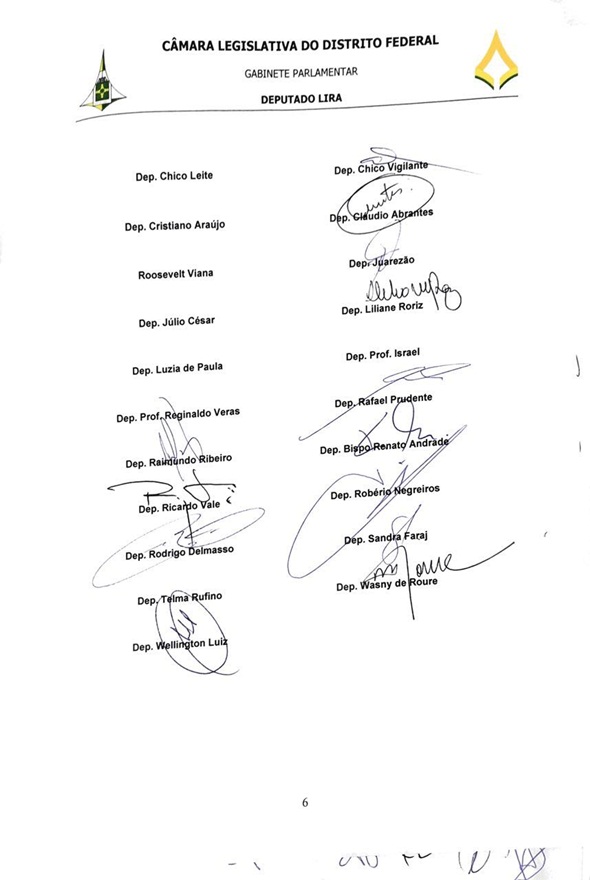 O parlamentar conseguiu a assinatura de 15 deputados — são necessárias oito para protocolar o pedido. São eles: Bispo Renato Andrade (PR), Celina Leão (PPS), Juarezão (sem partido), Wellington Luiz (PMDB), Raimundo Ribeiro (sem partido), Rodrigo Delmasso (PTN), Rafael Prudente (PMDB), Robério Negreiros (sem partido), Chico Vigilante (PT), Cláudio Abrantes (Rede), Ricardo Vale (PT), Liliane Roriz (PTB), Sandra Faraj (SD) e Wasny de Roure (PT), além de Lira.