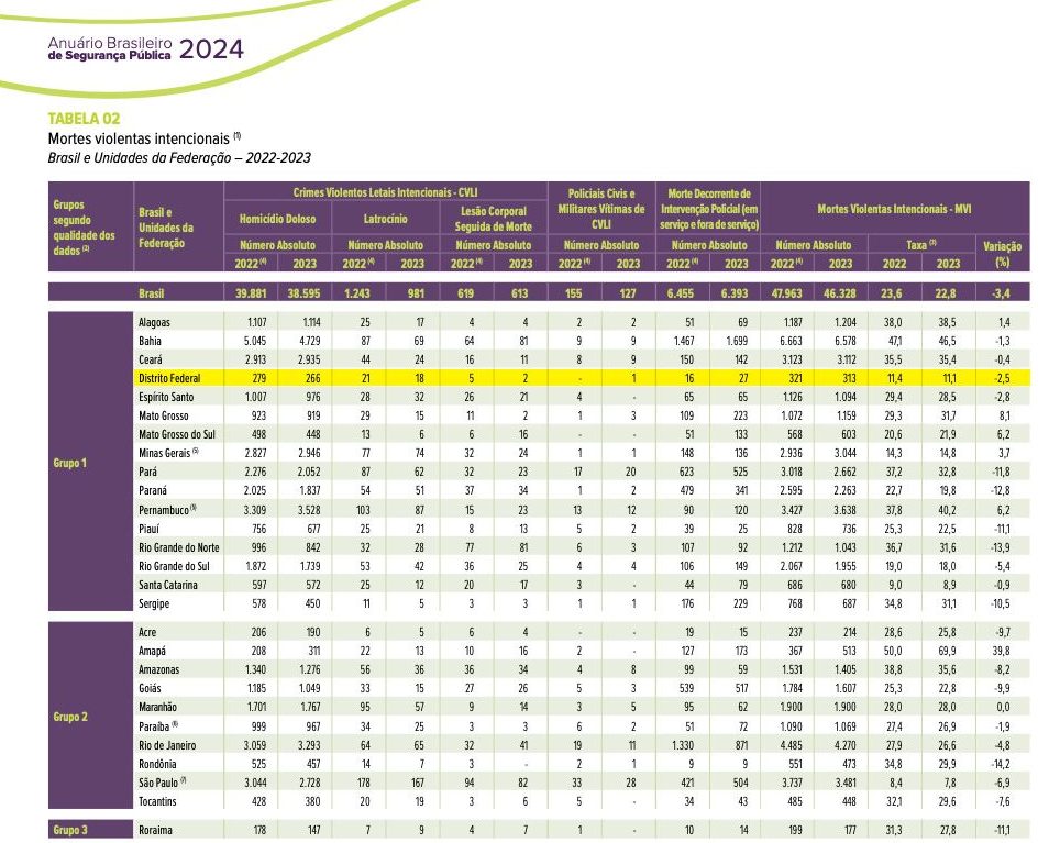 Em outra fonte oficial de informação do governo brasileiro, o Anuário Brasileiro de Segurança Pública 2024 indica ser o Distrito Federal, detentor de redução, em números absolutos, de todas as modalidades criminais, quando comparados os anos de 2022 e 2023.