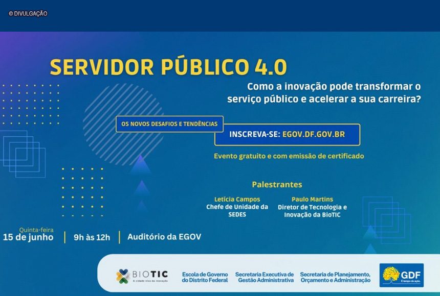 O Parque Tecnológico de Brasília (Biotic), em parceria com a Escola de Governo (Egov), vai promover, no dia 15 de junho, a palestra Servidor Público 4.0: como a inovação pode transformar o serviço público e acelerar a sua carreira?. O evento será das 9h às 12h, na Egov.