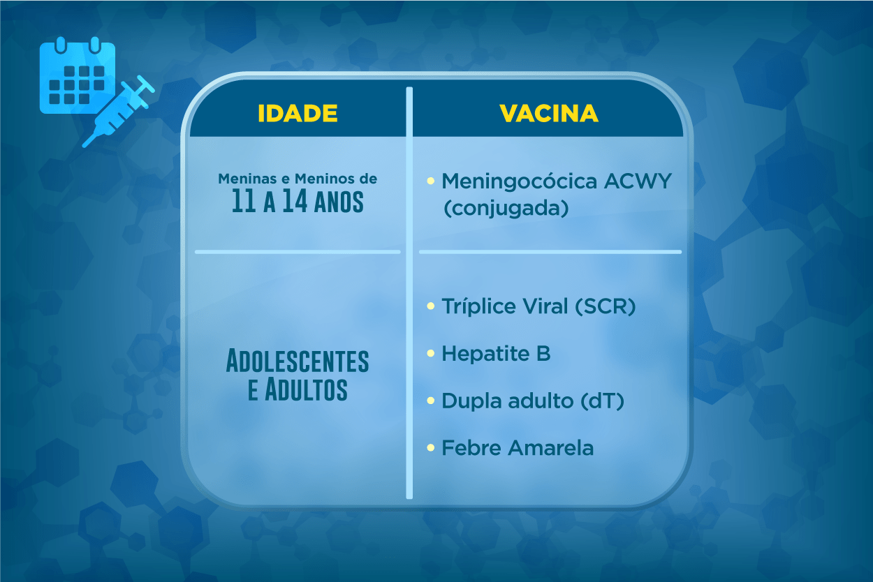 Até os 4 anos, a criança precisa cumprir um calendário com 14 tipos de imunizantes e mais de 20 doses entre reforços. Depois, a imunização se torna mais espaçada, com retorno apenas aos 9 anos, quando o programa traz a vacinação contra a HPV para meninos e meninas até 11 anos. Entre os 11 e 14 anos, a vacina é a meningocócica ACWY (conjugada), que protege contra a meningite.