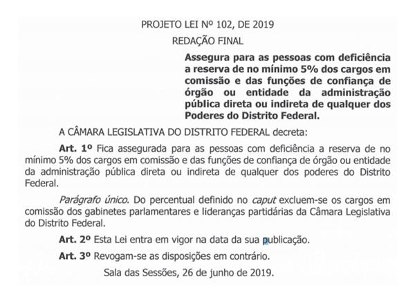 Pessoas com deficiência terão reserva de 5% das vagas em cargos de comissão e funções de confiança de órgãos da administração pública do Distrito Federal. A previsão consta no Projeto de Lei nº 102, cuja redação final foi divulgada pelo Diário da Câmara Legislativa desta terça-feira (16/07/2019) .