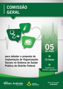 O deputado distrital, Bispo Renato Andrade (PR) deve realizar, em 5 de maio, às 15 horas, uma Comissão Geral para debater a proposta de implantação de Organizações Sociais (OSs) no Sistema de Saúde pública do DF, no auditório da Câmara Legislativa do DF (CLDF).