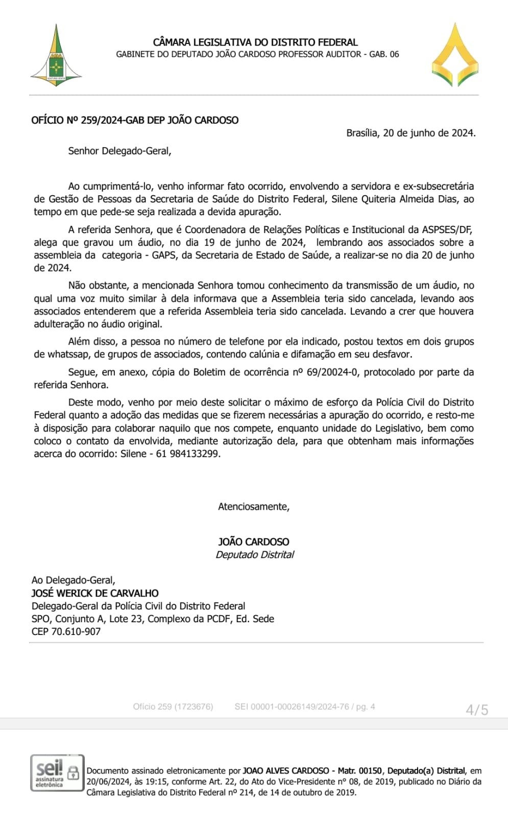 O deputado distrital, João Cardoso (Avante) encaminhou ofício em 20 de junho, ao Delegado-Geral da Delegacia Geral da Polícia Civil do DF (PCDF), José Werick de Carvalho, para informar um crime cometido contra a coordenadora do Associação dos Servidores Públicos da Saúde do DF (ASPSES-DF), Silene Almeida. Criminosos com intenção de esvaziar assembleia da carreira de Gestão e Assistência Pública à Saúde do Distrito Federal (GAPS), realizada na mesma data, no auditório da Câmara Legislativa do DF (CLDF), manipulou audio, com utilização da voz de Silene Almeida para avisar sobre o cancelamento do ato, algo que era falso.