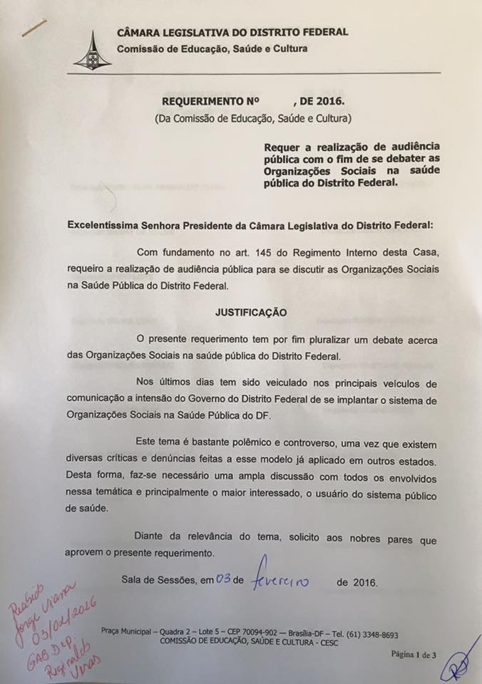 Na justificativa do Requerimento, Veras aponta, por necessidade de realização da audiência, a veiculação maciça, nos veículos de comunicação, a intenção de o GDF implantar as OSs na saúde do DF. “Este tema é bastante polêmico e controverso, uma vez que existem diversas críticas e denúncias feitas a esse modelo já aplicado em outros estados.”, consta no documento ao lembrar que reforça: “Dessa forma, faz-se necessário uma ampla discussão com todos os envolvidos nessa temática e principalmente o maior interessado, o usuário do sistema público de saúde.”.