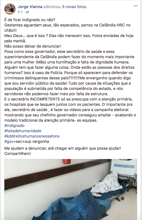 Na noite de domingo (25/Fev), o vice-presidente do Sindicato dos Auxiliares e Técnicos em Enfermagem do DF (SINDATE-DF), Jorge Vianna, denunciou o descaso dos gestores da Secretaria de Estado de Saúde do DF (SES-DF) com as grávidas internadas no Hospital Regional de Ceilândia (HRC). Sem leitos, as mulheres aguardam para ganharem os bebês, deitadas em colchões no chão, do corredor do hospital.