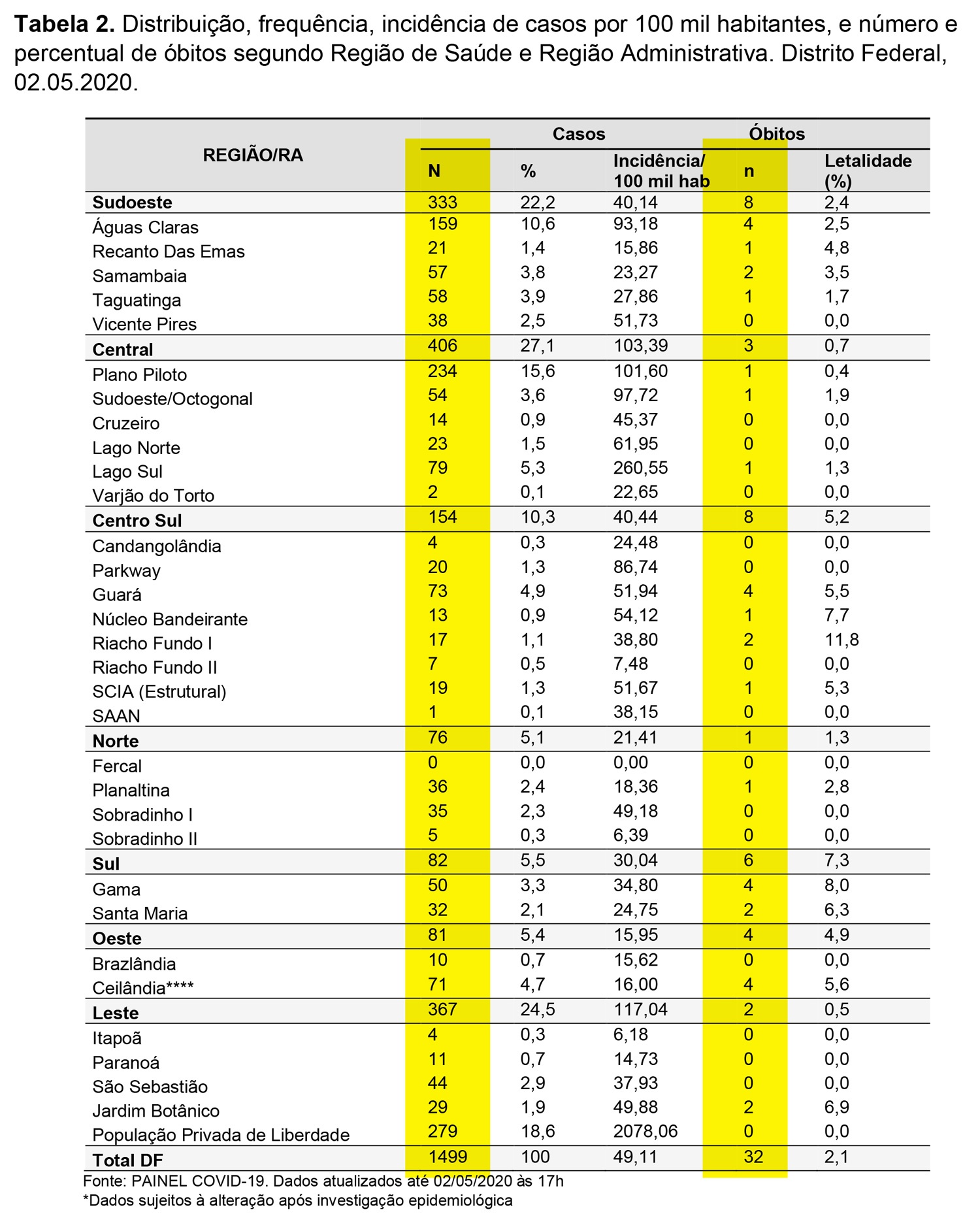 Dados do Boletim Epidemiológico da SES-DF, ainda com totalização de 1.499 casos confirmados, demonstram a distribuição da distribuição da Covid-19, mas Regiões Administrativas (RAs). A RA Plano Piloto, com 238 casos confirmados e um óbito, seguido de Águas Claras com 150 confirmações e quatro óbitos, permanecem no topo do ranking das RAs, de pessoas contaminadas com o coronavírus.
