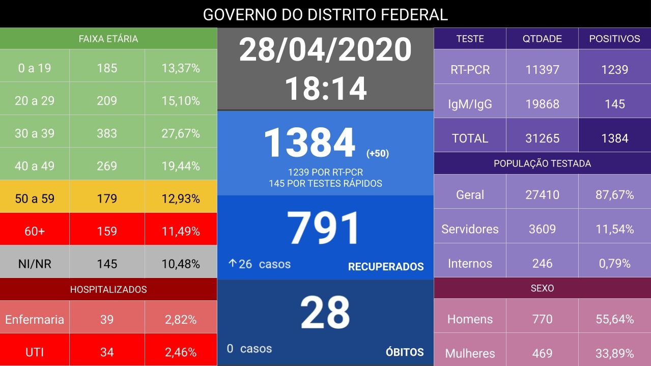 A Secretaria de Saúde do Distrito Federal divulgou os números dos infectados pelo novo coronavírus (Covid-19), no início da tarde desta terça-feira (28/04). Ao todo, 1.384 pessoas foram contaminadas pelo Covi-19. Desses, 145 foram detectados por exames rápidos. A capital do país conta com um total de 28 pessoas registros de óbitos decorrentes da doença.