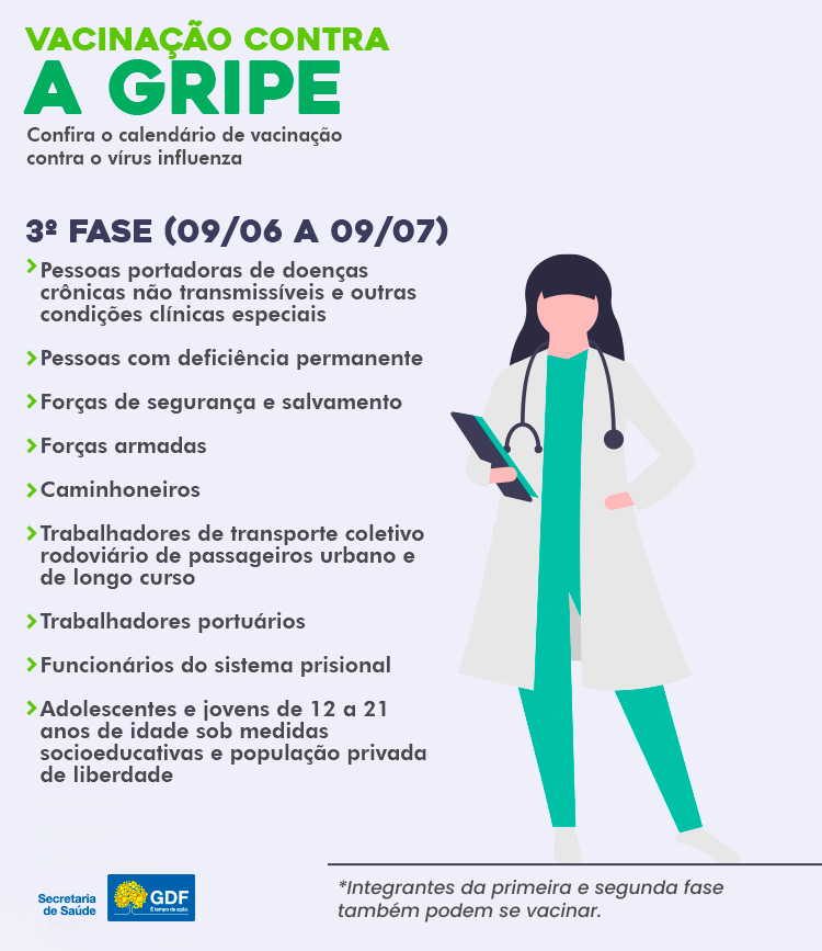 A Secretaria de Estado de Saúde do DF inicia na quarta-feira (9/Jun), a terceira fase de vacinação contra a gripe influenza. A etapa faz parte da 23ª Campanha Nacional de Vacinação Contra a Gripe e tem como meta imunizar 342.327 pessoas do novo grupo prioritário, além daquelas que não procuraram os pontos de imunização nas duas fases anteriores. Até o momento, foram vacinadas 339.490 pessoas.