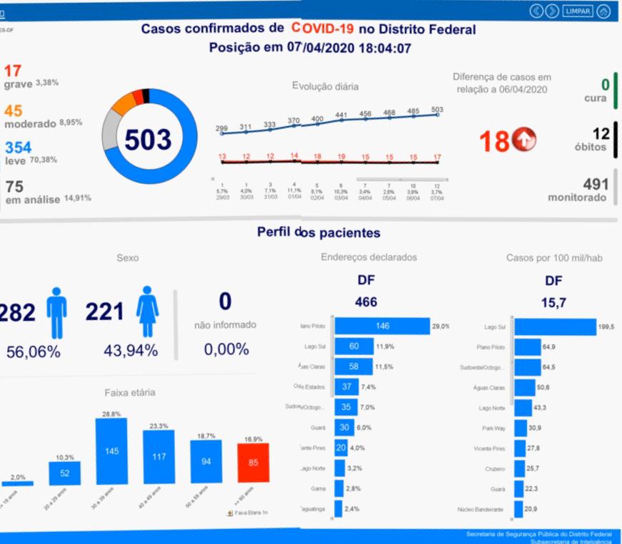 Atualmente, o DF conta com 503 casos confirmados de pessoas infectadas pela Covid-19, com um total de 12 óbitos registrados no DF. De acordo com boletim Epidemiológico da SES-DF, dos casos confirmados, 282 (56%) são do sexo masculino, com mediana de idade de 43 anos, variando entre 0 e 99 anos, com maior proporção na faixa etária de 30 a 39 anos e maior incidência na faixa de 50 a 59 anos (Tabela 1). Entre os confirmados, 60 (12%) estão hospitalizados, 40 destes em Unidade de Terapia Intensiva (UTI).
