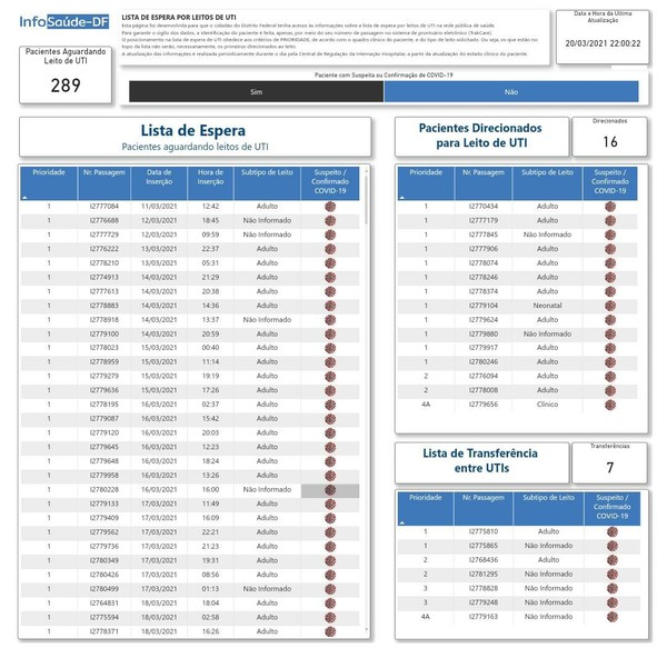 O Distrito Federal atingiu neste sábado (20) o maior número de pessoas com Covid-19 aguardando por um leito de Unidade de Terapia Intensiva (UTI), desde que os dados passaram a ser divulgados pela Secretaria de Saúde do DF. Ao todo, 312 pessoas estão na fila – 101 estão com prioridade 1, ou seja, com urgência. Conforme o último boletim divulgado às 22h, tem paciente aguardando transferência há 11 dias.