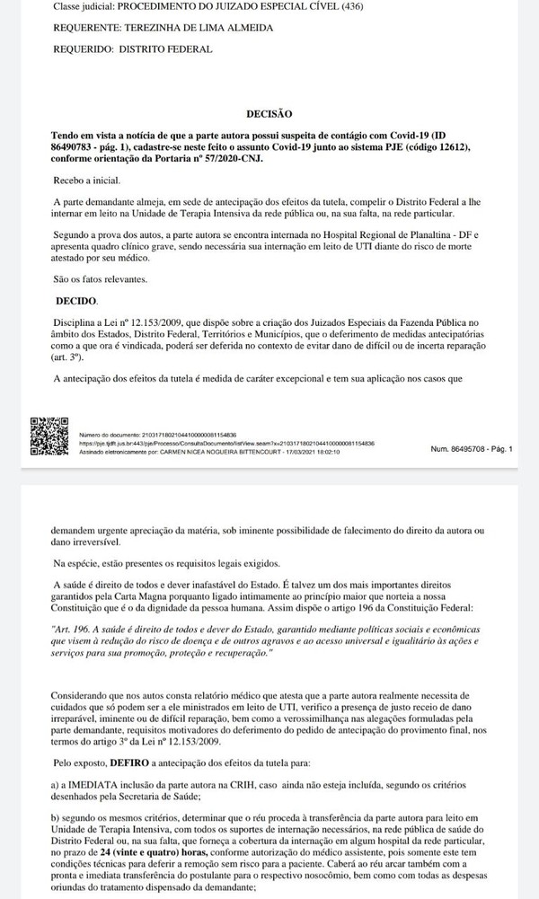 “Nós conseguimos uma liminar na Justiça e o juiz determinou que o GDF conseguisse um leito de UTI num prazo máximo de 24 horas, o que não foi cumprido. Infelizmente nessa última noite minha avó se foi, sem dignidade”, relatou (veja decisão abaixo).