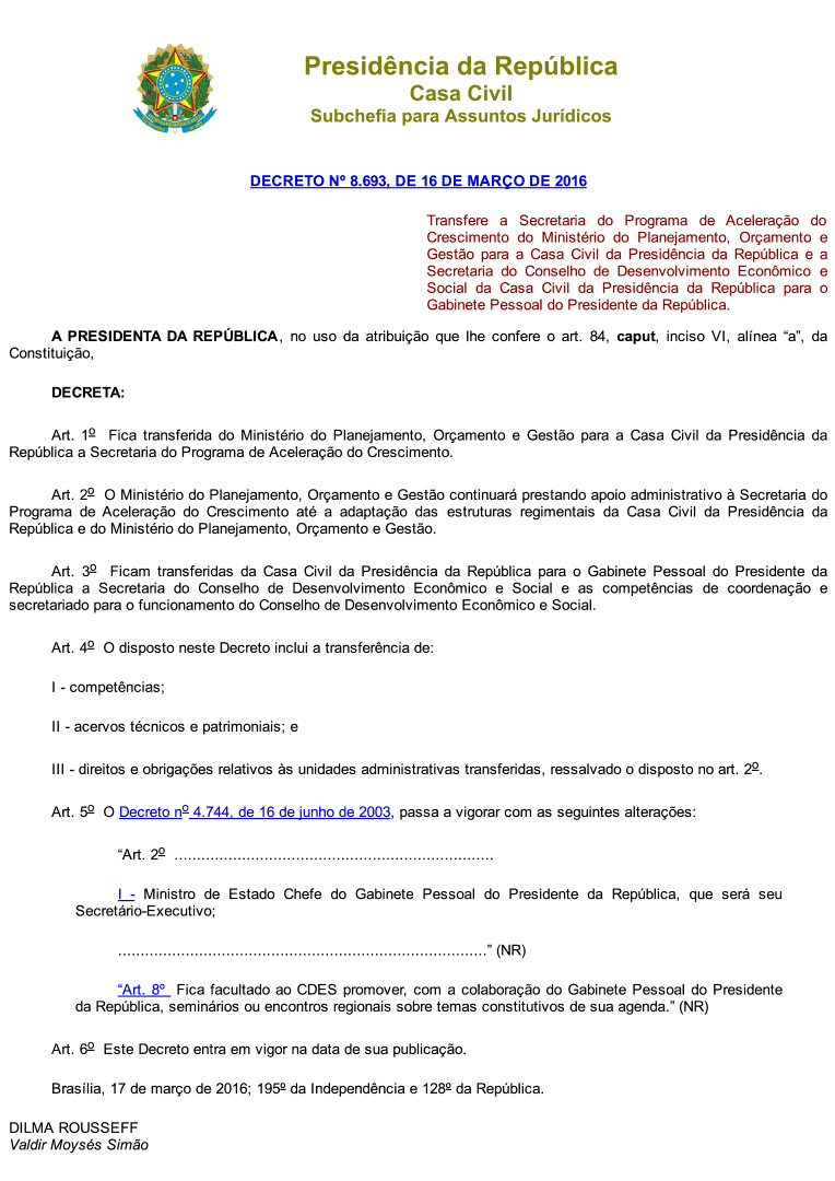 Isso porque um dia antes de dar posse ao novo ministro (16/Mar), quando todos os olhos estavam voltados ao áudio em que a Presidente avisou da entrega do Termo de Posse ao Lula para, supostamente, evitar uma possível prisão, Dilma Rousseff publicou o Decreto nº 8.693, em que transferiu, as atribuições da gestão do PAC do Ministério do Planejamento, Orçamento e Gestão (MPOG) para a casa Civil, a ser administrada pelo ex-presidente Lula.