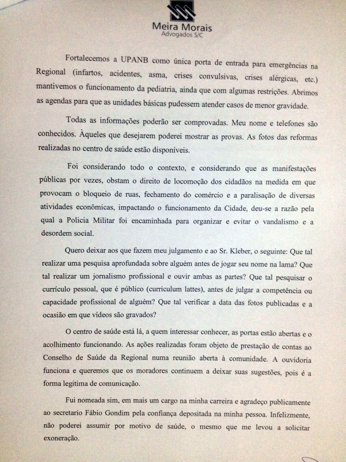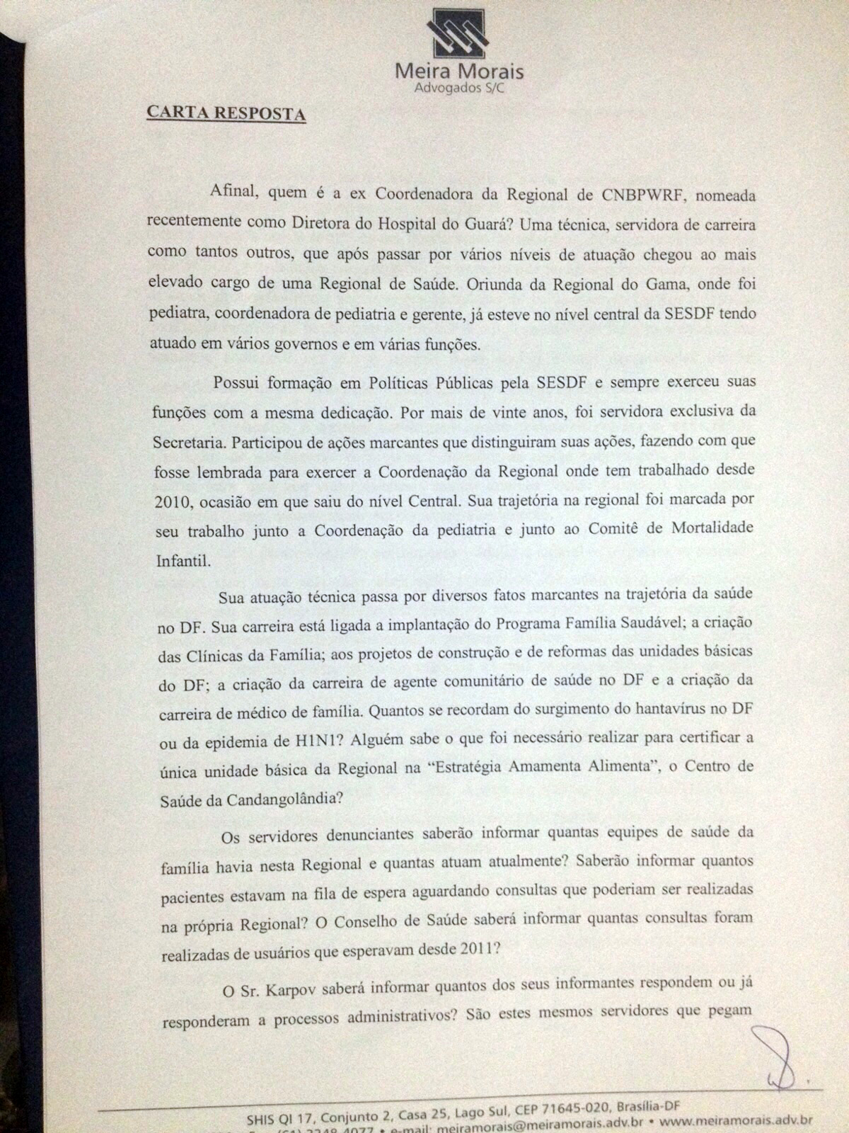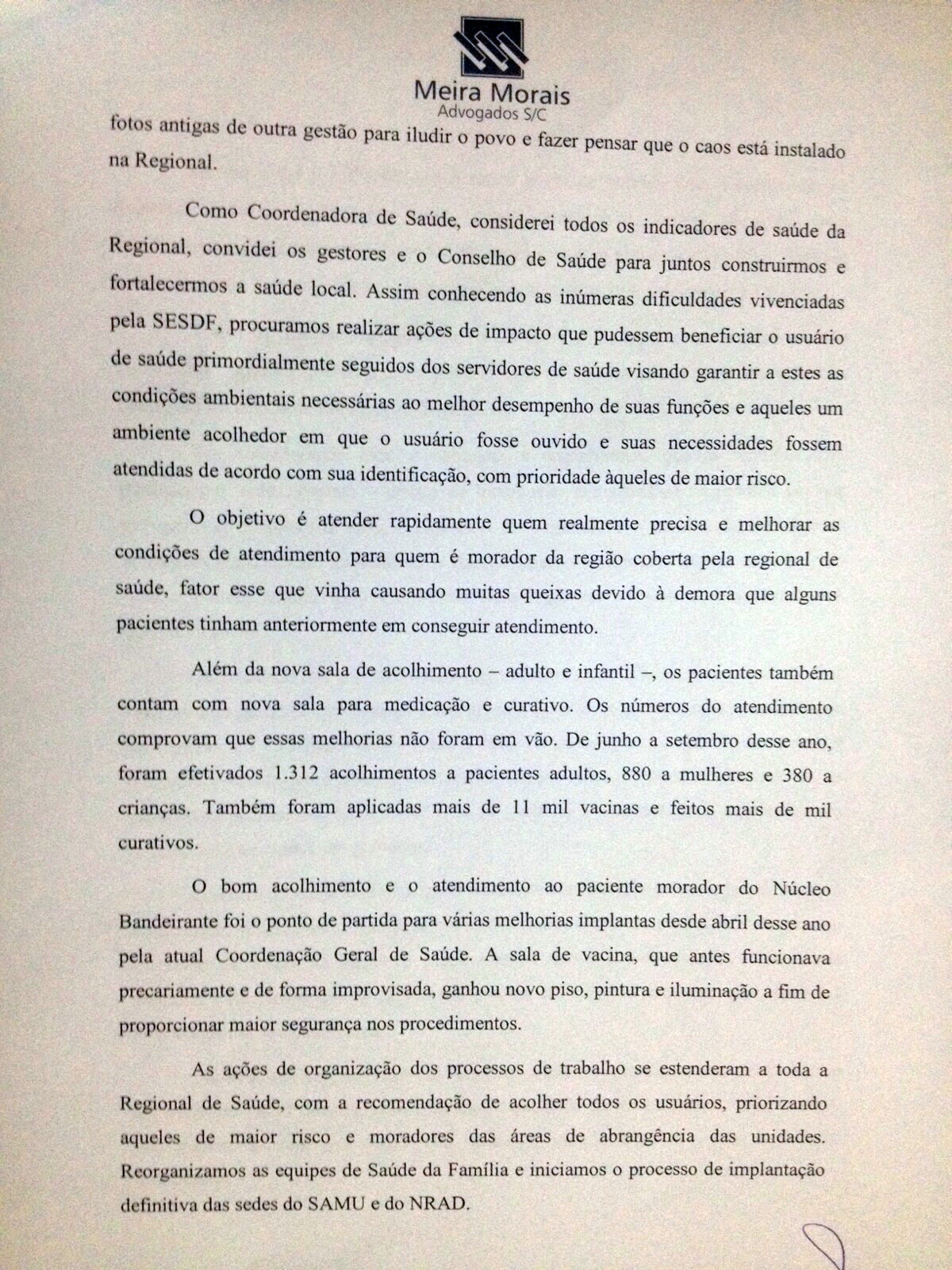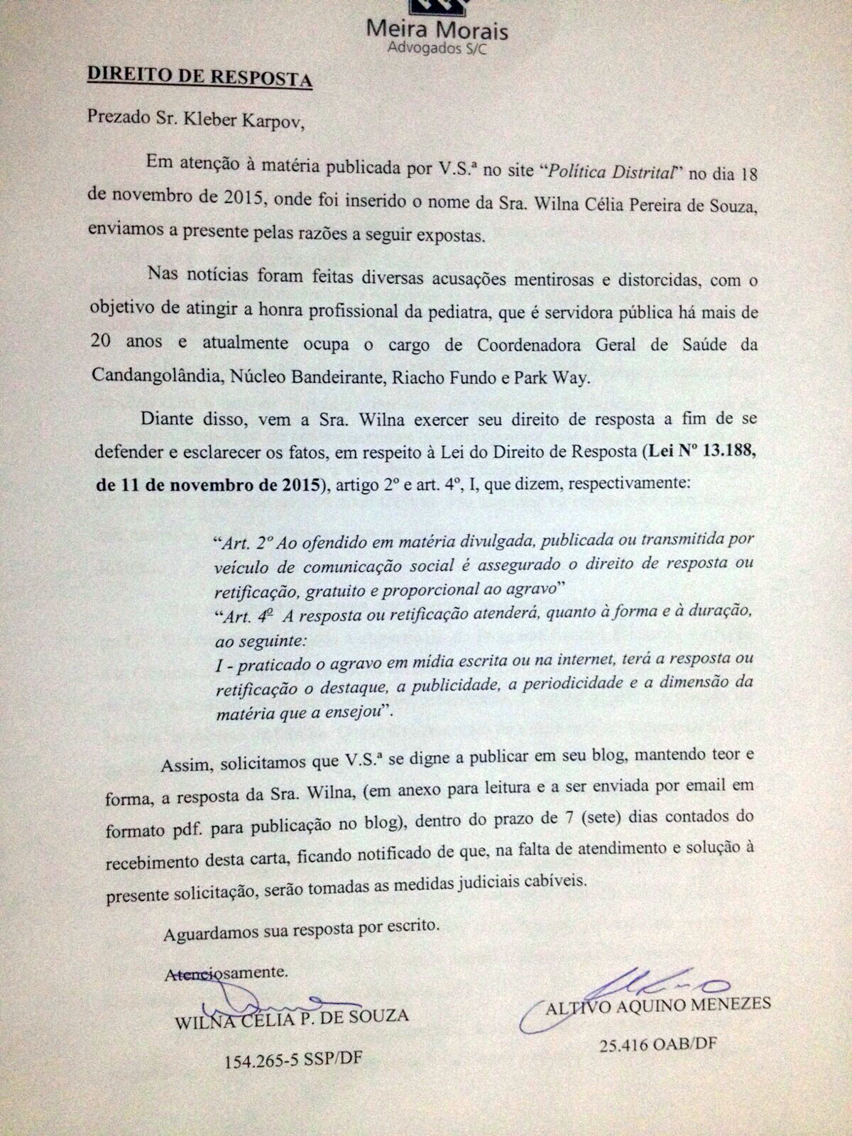 A ex-coordenadora geral de Saúde de Núcleo Bandeirante, a pediatra, Wilna Célia Pereira de Souza, Wilna Célia, reportou-se ao Política Distrital, por meio de empresa de advocacia que a representa, no intuito de solicitar direito de resposta, baseado na Lei do Direito de Resposta, nº 13.188 de 11 de novembro de 2015, pertinente à matéria publicada por este Blog (18/Nov), intitulada, “Polícia para quem precisa”: Moradores cobram qualidade na Saúde de Núcleo Bandeirante, sob alegação de ser omisso em relação a ouvir a fonte, e publicar informações inverídicas.