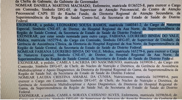 Segundo a Secretaria de Saúde do DF, o ex-diretor do Hran, Leonardo Ramos, médico urologista, recebeu um convite de trabalho de um hospital da rede particular no início de fevereiro. “Pelo seu excelente desempenho”, enfatizou a pasta. O médico formalizou o pedido de exoneração do cargo em 16 de fevereiro.