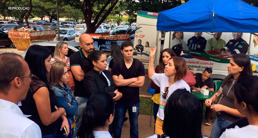 “Fomos ‘in loco’ ouvir os profissionais enfermeiros da rede privada na Setor Hospitalar Sul. O que os colegas de toda rede privada do DF tem passado é uma vergonha! Além de terem repousos que são esconderijos (mistos e alguns dormem no chão, pois não tem cama para todos), não tem direito a folga compensatória, piso salarial que não paga nem o que gastaram na faculdade, alterações e dificuldade nos seus planos de saúde, vale refeição de 15 reais, assédio moral e são a única categoria juntamente com os técnicos de enfermagem que são revistados ao saírem do hospital.”