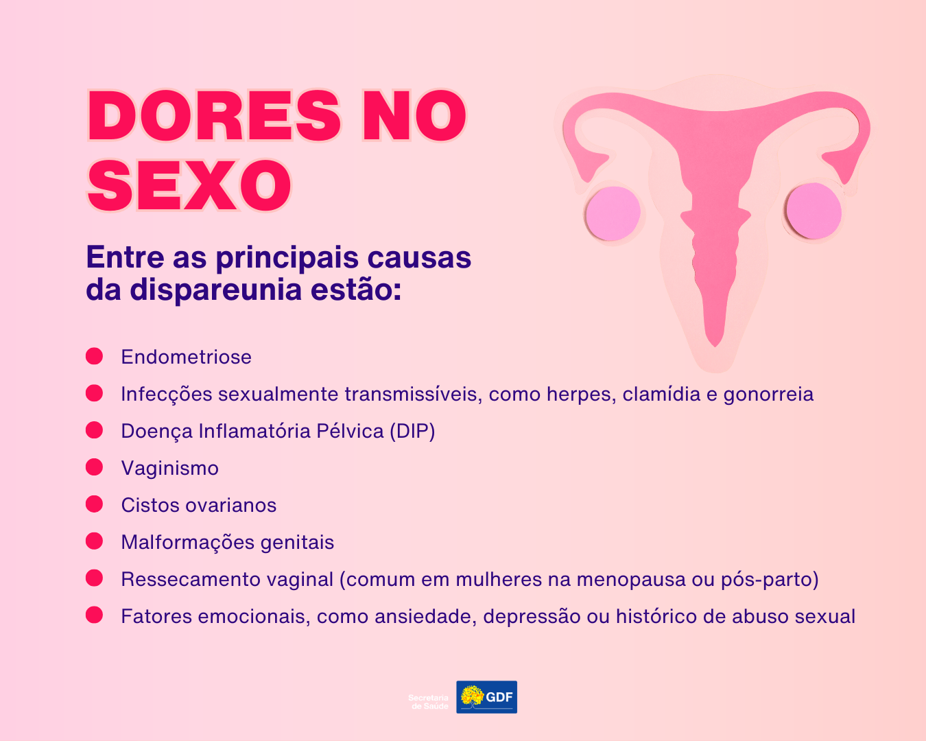 A ginecologista da SES-DF reforça a importância de procurar atendimento médico ao perceber algum sintoma, para que a causa seja adequadamente diagnosticada. Quando não investigada e tratada, a dor durante o sexo pode trazer sérias consequências para a saúde mental da mulher e afetar seu relacionamento.