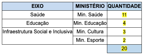 Com as propostas selecionadas, o Distrito Federal receberá investimentos do Governo Federal para realizar 20 obras, que irão melhorar o acesso a serviços de saúde, educação, esporte e cultura. Os benefícios alcançarão mais de 2,8 milhões de brasilienses, 100% da população do DF.