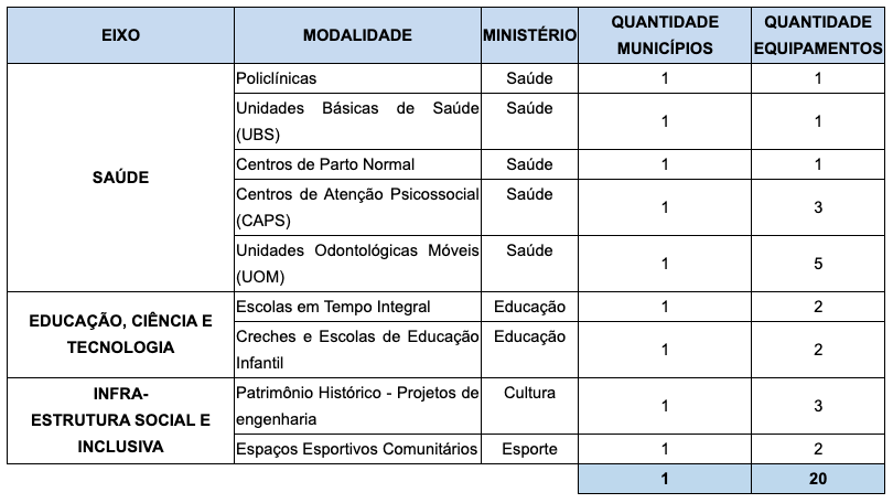 No total, foram selecionados 6.778 obras e empreendimentos nos 26 estados e no Distrito Federal, alcançando 59% dos municípios brasileiros. As seleções priorizaram a cobertura de vazios assistenciais, além dos critérios de cada modalidade, conforme divulgado no lançamento do programa.