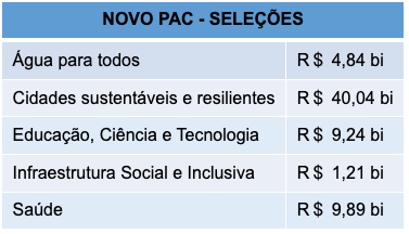 Os projetos selecionados se somam às obras já anunciadas pelo Governo Federal, em agosto de 2023, quando foi lançado o Novo PAC. O programa está consolidado como uma forte parceria entre Governo Federal e setor privado, estados, municípios e movimentos sociais, para gerar emprego e renda, reduzir desigualdades sociais e regionais em um esforço comum e comprometido com a transição ecológica, neoindustrialização, crescimento com inclusão social e sustentabilidade ambiental.