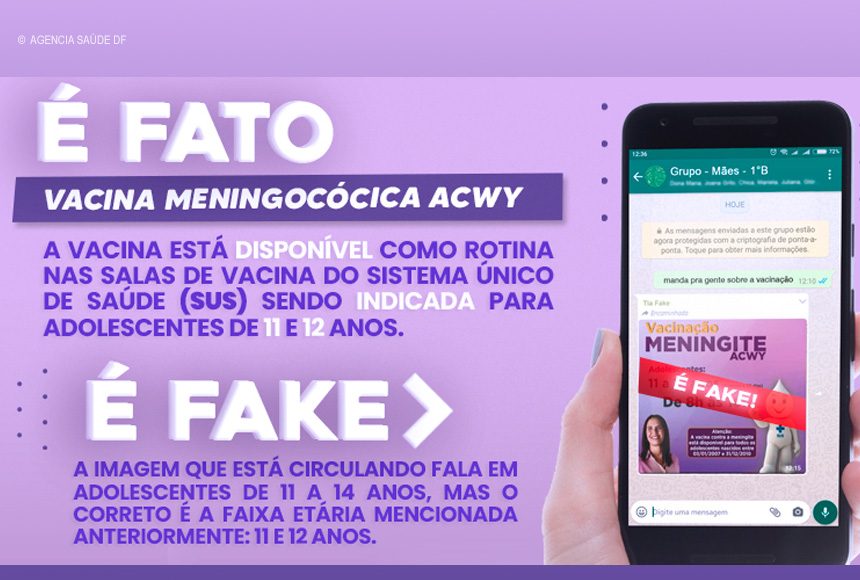 Um banner com informações sobre a vacinação contra meningite ACWY está circulando em grupos de aplicativos de conversas. Entretanto, a Secretaria de Saúde esclarece que se trata de uma Fake News e que a pasta não foi responsável pela divulgação desse conteúdo que, inclusive, traz informação errônea sobre o público-alvo da vacina.