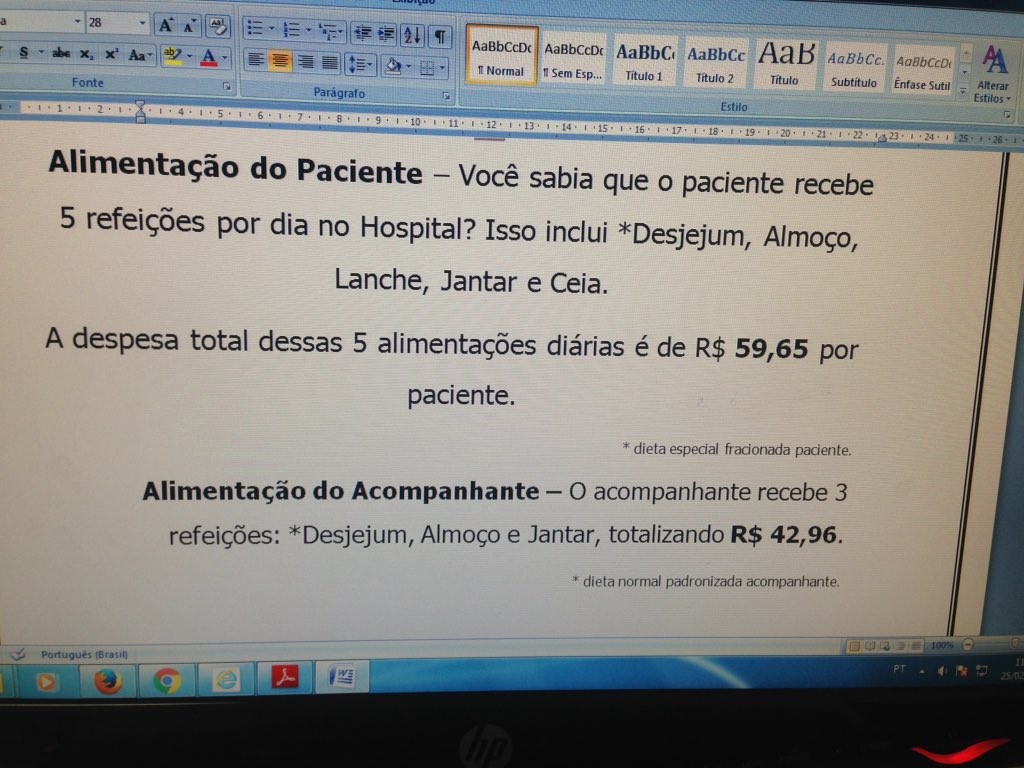 “Hoje eles [os servidores] recebem por mês R$ 373, por mês. Para efeito de comparação, a refeição de um acompanhante no hospital custa R$ 42,96, por dia. Isso dá R$ 945,12 por mês, considerando 22 dias úteis. Nem vamos comparar com paciente, que a refeição custa [ao Estado] R$ 59,65 por dia! Ou seja, ganhamos R$ 16,95 por dia de auxílio alimentação. Um terço em relação do paciente!”, explica a servidora ao soltar uma pitada de inveja: “Ficamos desejando a comida do paciente hospitalar!”, concluiu.