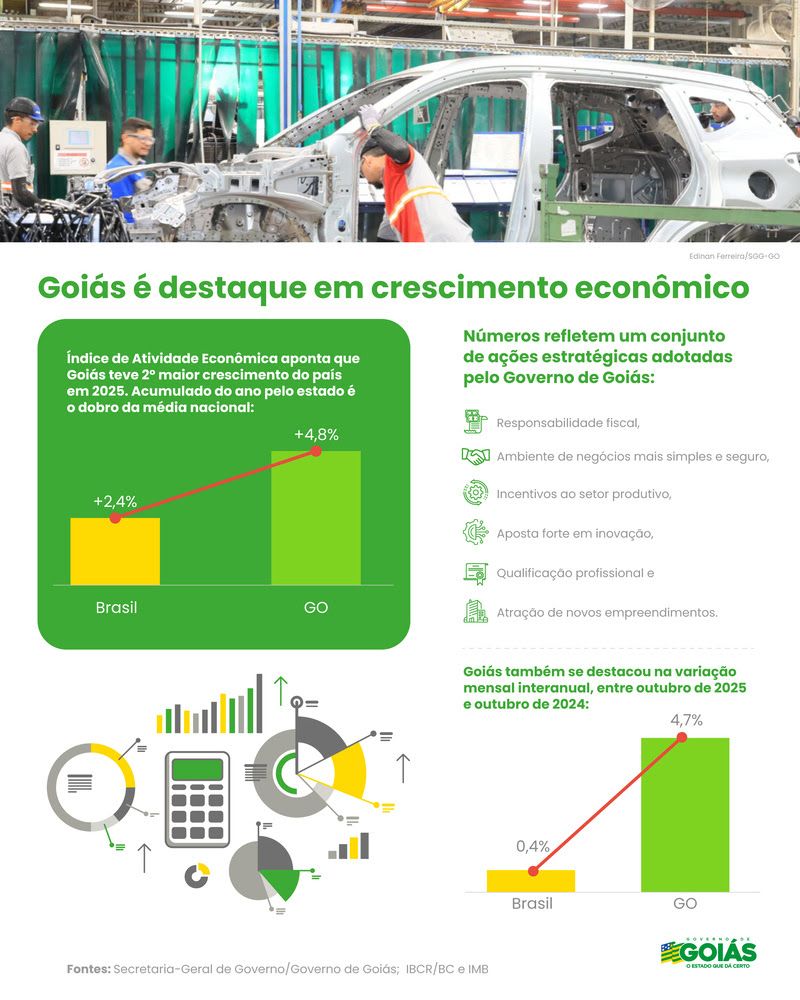 Goiás registrou alta de 4,8% no acumulado de 2025 e se consolidou como a segunda economia que mais cresce no Brasil. O levantamento do Índice de Atividade Econômica Regional (IBCR), divulgado pelo Banco Central nesta quarta-feira (31/Dez), aponta que o estado atingiu o dobro da média nacional de 2,4%. O avanço resulta de ações voltadas à competitividade e ao fortalecimento dos setores produtivos goianos no mercado interno.