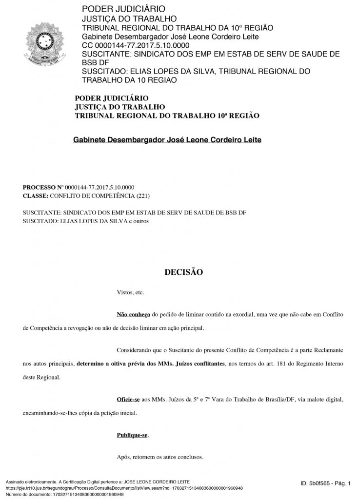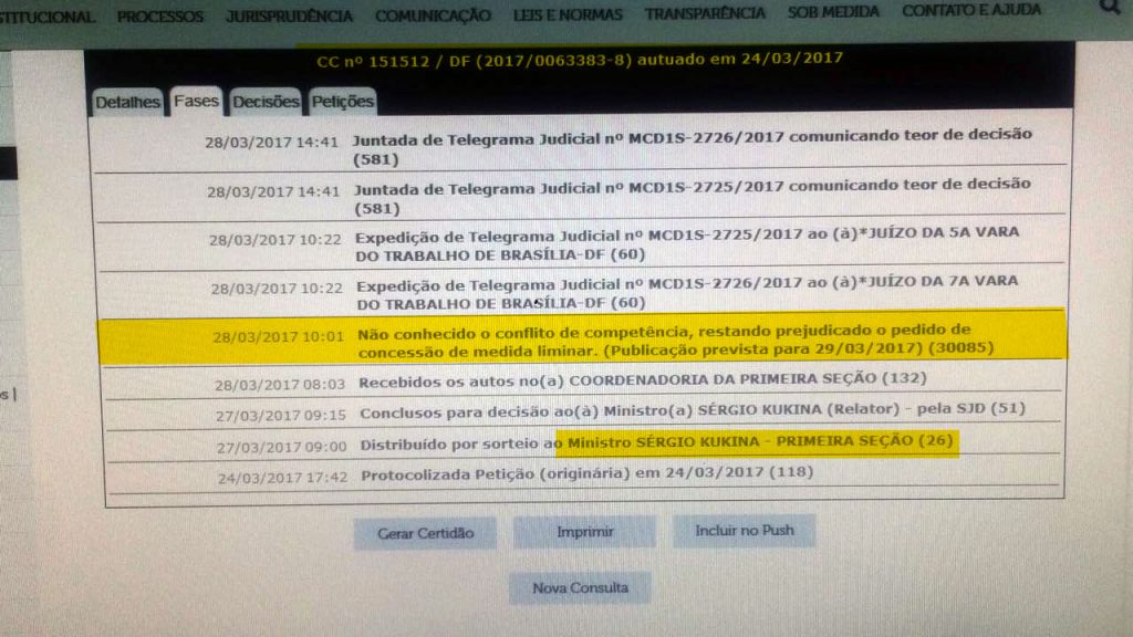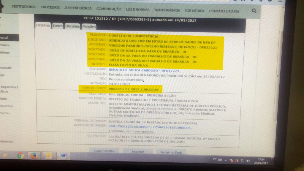 E finalmente, de acordo com Lopes, no STJ, o SINDSAÚDE-DF tentou por meio do processo 0063383-02-2017-3.00.0000, protocolada em 24 de março, para também questionar, a competência da Justiça do Trabalho em julgar o mérito da ação movida pelo Sindicalista. Nesse caso, o relator do processo, o ministro, Sérgio Kukina proferiu “Não reconhecido o conflito de competência, restando prejudicado o pedido de concessão de medida liminar.”.