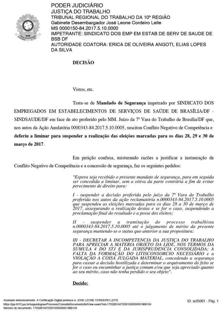 Em outra ação, dessa vez um Mandato de Segurança (MS) no. 0000150-84.2017.5.10.0000, impetrada no “no final de semana” (26/Mar), o SINDSAÚDE-DF tentou por uma segunda vez, garantir a realização das eleições. Nesse caso a decisão, o mesmo desembargador, considerou uma “petição confusa, misturando razões a justificar a instauração de Conflito Negativo de Competência e a concessão de segurança”, para a suspensão da decisão proferida pelo juízo da 7ª Vara do Trabalho proferida nos autos da ação reclamatória n.0000343-84.2017.5.10.0005, sobre a falsificação de documentação, que corre em segredo de Justiça; a suspensão do referido processo durante a tramitação do MS e ainda a decretação de incompetência da Justiça do Trabalho de julgar a ação.