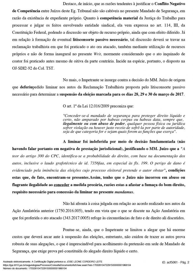“Na verdade foi julgado dois conflitos de competência, um no STJ e o outro no TRT que não foi concedido a liminar. Eu entendo que é competência da Justiça comum, apreciar a matéria referente a discussão entre o sindicato e seu filiado quanto a matéria eleitoral. Fundamentei nisso, ok? Essa é a discussão do Mandado de Segurança. Não se trata de derrota. Nesse momento o que se está discutindo é saber qual o juiz vai julgar a ação do Elias, em relação ao questionamento da eleição e ao registro da chapa dele pela Comissão eleitoral. É só isso.”, afirmou.