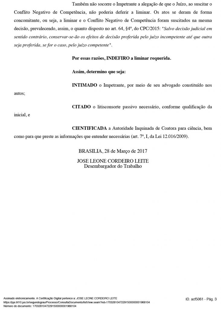 Na ação de Conflito de Competência, no. 0000144-77.2017.5.10.0000, impetrada em 24 de março, o desembargador, José Leone Cordeiro Leite, às 10h43 do dia 28, proferiu: “Não conheço do pedido de liminar contido na exordial, uma vez que não cabe em Conflito de Competência a revogação ou não de decisão liminar em ação principal.”.