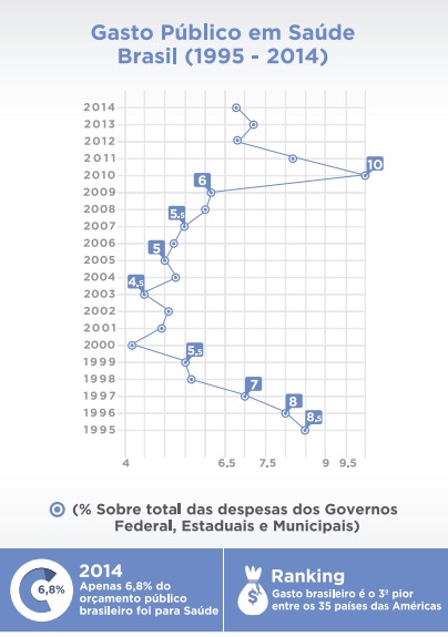 Dados publicados pela Organização Mundial da Saúde (OMS) revelam que, em 2014, apenas 6,8% do orçamento público brasileiro foi destinado à saúde. O cálculo levou em conta a soma das despesas da União, dos estados e municípios. Trata-se do pior desempenho neste item registrado desde 2010. De 2013 para 2014, a queda no índice foi de 4%. Em comparação com o número de 2010, o recuo chegou a 32%. O retrato também fica longe do ideal quando comparado com outros países.