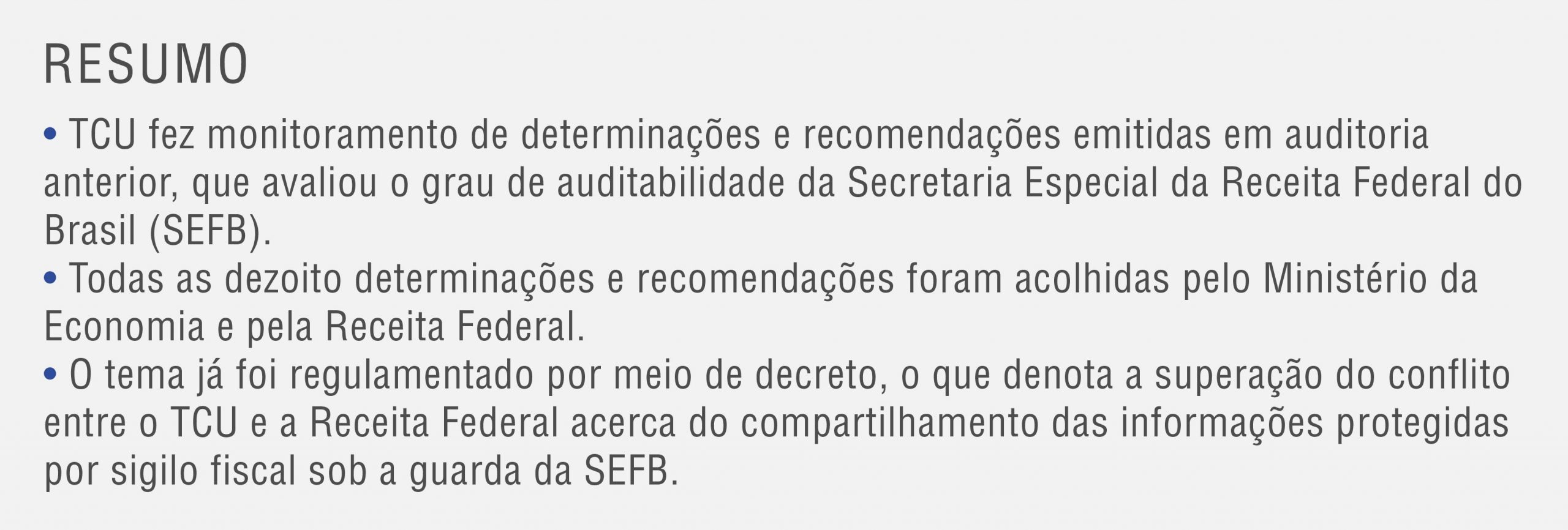 Para o relator do processo, ministro Raimundo Carreiro, “esses marcos regulamentares denotam a superação do conflito entre o TCU e a Receita Federal acerca do compartilhamento, para as ações de controle externo a cargo deste Tribunal, das informações protegidas por sigilo fiscal sob a guarda da SEFB”.