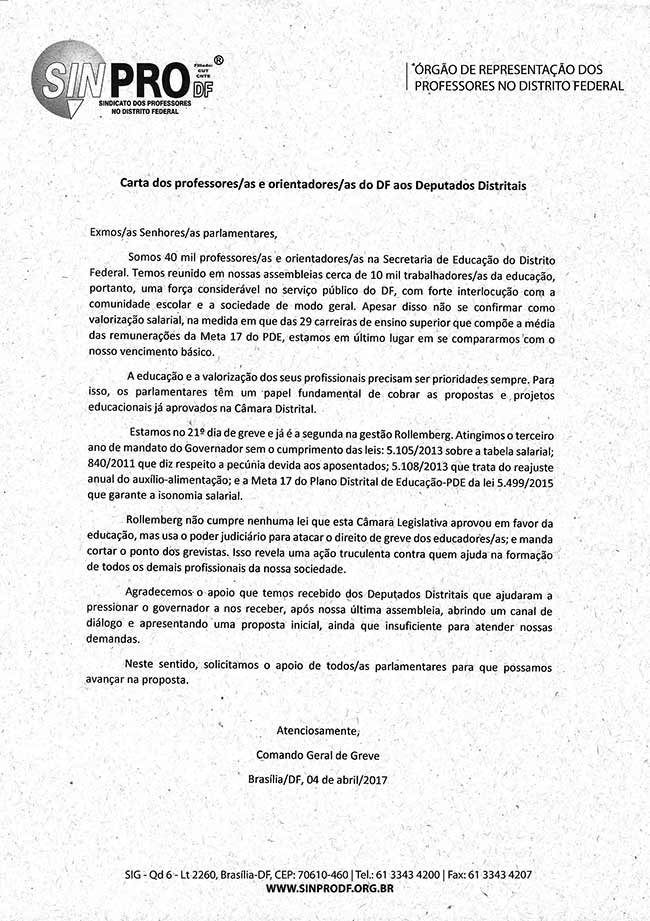 Após a assembleia geral, professores/as e orientadores/as educacionais caminharam até a Câmara Legislativa. Lá, entregam uma carta aos deputados distritais solicitando apoio dos parlamentares para pressionar o GDF a avançar na direção de uma proposta que diga respeito às reivindicações da categoria. O ato de entrega da carta está sendo no auditório da CLDF, completamente lotado.